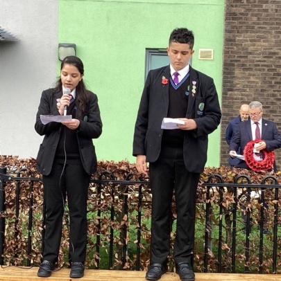The ceremony began with Mr. Patterson sounding 'The Last Post,' followed by a respectful two-minute silence. The service continued with a recital of the poem 'In waters deep' by Eileen Mahoney, delivered beautifully by our Head Girl, Aleesa and Head Boy, Youssef.